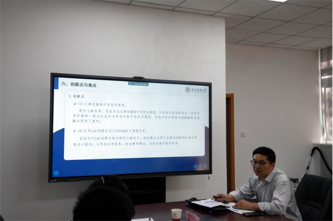 蔡晋华、许志东和陈超依次对《核心素养视域下幼儿健康生活素养的培育研究》《基于STEAM理念生物学特色校本课程开发实施》和《乡土地理资源与初中地理课程融合的实践研究》三个项目进行开题汇报,全面阐述项目的选题背景、选题目的、研究内容、研究过程与方法以及论文创新点等核心问题。